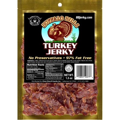 Buffalo Bills 1.5oz Turkey Jerky – Ten 1.5oz Packs. Buffalo Bills Turkey Jerky is made from tender pieces of lean 100% turkey breast, marinated in a mild blend of teriyaki sauce and spices; packed in a gold & silver foil 1.5oz pouch. Our Turkey Jerky is a healthy (yet still tasty) alternative to beef jerky. It’s low in carbohydrates, high in protein, and only 90 calories per 1oz serving. This jerky is 97% fat free and contains no MSG, no nitrites, no erythorbate, and no fillers. USDA inspected and approved.