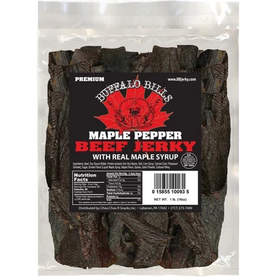 One full pound of our Buffalo Bills Premium Maple Pepper Beef Jerky in random size pieces. Pieces vary in size from 1″ to 5″ in length. After vacationing in Vermont, Buffalo Bill came back with this enticing variation on our classic Premium Hickory beef jerky. Using real maple syrup with an added bite of cracked black pepper, this inspired flavored combo is sure to create a new wave of jerky cravings! Please note the “Real Maple Syrup” showing on the front of the package qualifies as an “included ingredient” by the USDA – this is why it is not mentioned again in the ingredient statement. Our line of Buffalo Bills Premium Beef Jerky is available in 6 distinct flavors – Hickory, Maple Pepper, Black Pepper, Beer (beef jerky marinated in a Honey Brown Ale), Chesapeake, and Reaper.