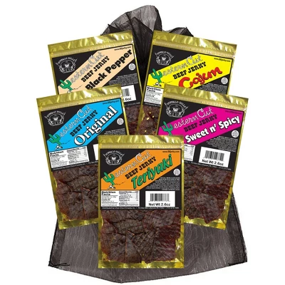 Buffalo Bills 5-ct Assorted Western Cut Beef Jerky Sampler – Five 2.6oz Packs. Packed in a sheer black organza bag, our Buffalo Bills Western Cut Beef Jerky Samplers are a great choice for those who can’t decide which jerky they want to try next. Each Western Cut Sampler includes 5 resealable packs of jerky – one of out five great flavors – Cajun, Original, Black Pepper, Sweet n Spicy, and Teriyaki. Each product is made in the USA using only US-raised beef – USDA inspected and approved. Makes a great gift, too!