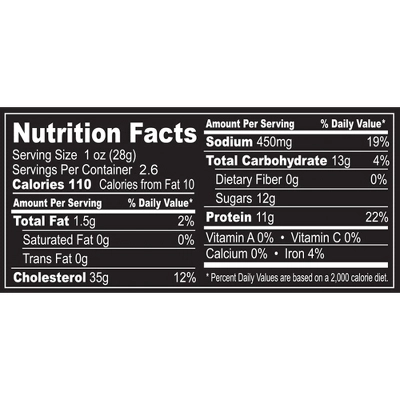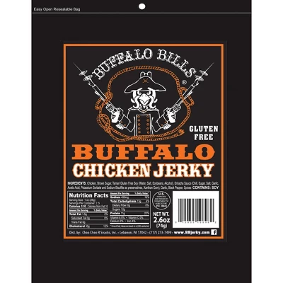 Packed in a 2.6oz resealable pouch, our Buffalo Bills Buffalo Chicken Jerky has that same great spicy kick you get from an order of Buffalo chicken wings. Made with 100% chicken breast meat, this tender jerky is marinated in a blend of Sriracha sauce, brown sugar, garlic, black pepper, and spices. Buffalo Bills Buffalo Chicken Jerky is gluten free, low in fat, high in protein, and has only 110 calories per serving.