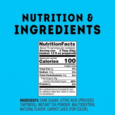 - 1 CANISTER = 28 QUART: Recommendation to simply mix 2 tablespoons of iced tea mix with 12 fl oz of cold water or 1/3 cup with 1 quart of cold water for a total of 28 quarts per canister