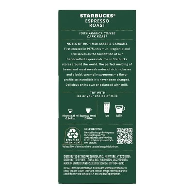 Enjoy the authentic café taste of Starbucks coffee at home like never before on Nespresso Original Machines. Made with the premium-quality Starbucks coffee that you know and love, Starbucks by Nespresso capsules are developed with Nespresso to work perfectly with Nespresso Original Machines and are fully recyclable through the Nespresso recycling program. Each cup of Starbucks Espresso Roast dark-roast espresso is rich with molasses and caramel notes and is perfect for making classic espresso drinks. Each precision-brewed Starbucks espresso is made with 100% arabica coffee beans. Authentically delicious perfection is just a cup away. Nestlé uses Starbucks trademarks under license. NESPRESSO is a registered trademark of Société des Produits Nestlé S.A., Vevey, Switzerland. NET WT 2.01 OZ (57 g)