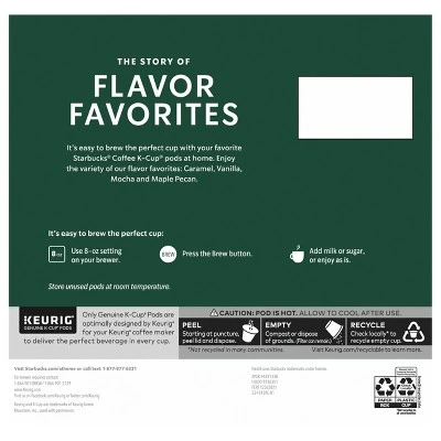 Explore four of our flavor favorites in this oh-so-delicious variety pack. You’ll discover an array of delightful Starbucks naturally flavored coffees, like Starbucks Naturally Flavored Caramel Coffee with buttery and smooth notes, Starbucks Vanilla Naturally Flavored Coffee with velvety and rich notes, Starbucks Mocha Naturally Flavored Coffee with chocolaty and luscious notes, and Starbucks Maple Pecan Naturally Flavored Coffee with toasty and sweet notes. This Starbucks variety pack lets you explore delicious naturally flavored coffees that are perfect for sipping. Nestlé uses Starbucks trademarks under license. Keurig and K-Cup are trademarks of Keurig Green Mountain, Inc., used with permission.