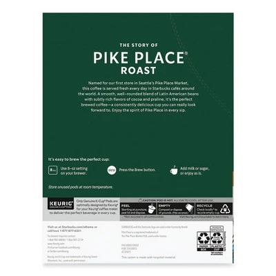 Starbucks Pike Place Coffee K-Cups Pack is blended with soft acidity, smooth body and subtle flavors of cocoa and rich praline. It’s a satisfying cup that’s rich in all flavors yet balanced enough to enjoy every day. K-Cups is for the Keurig brewing system. This coffee pod is sold with 24 pods per box.