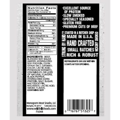 - Premium hickory smoked top round marinated in soy sauce, garlic, and black pepper